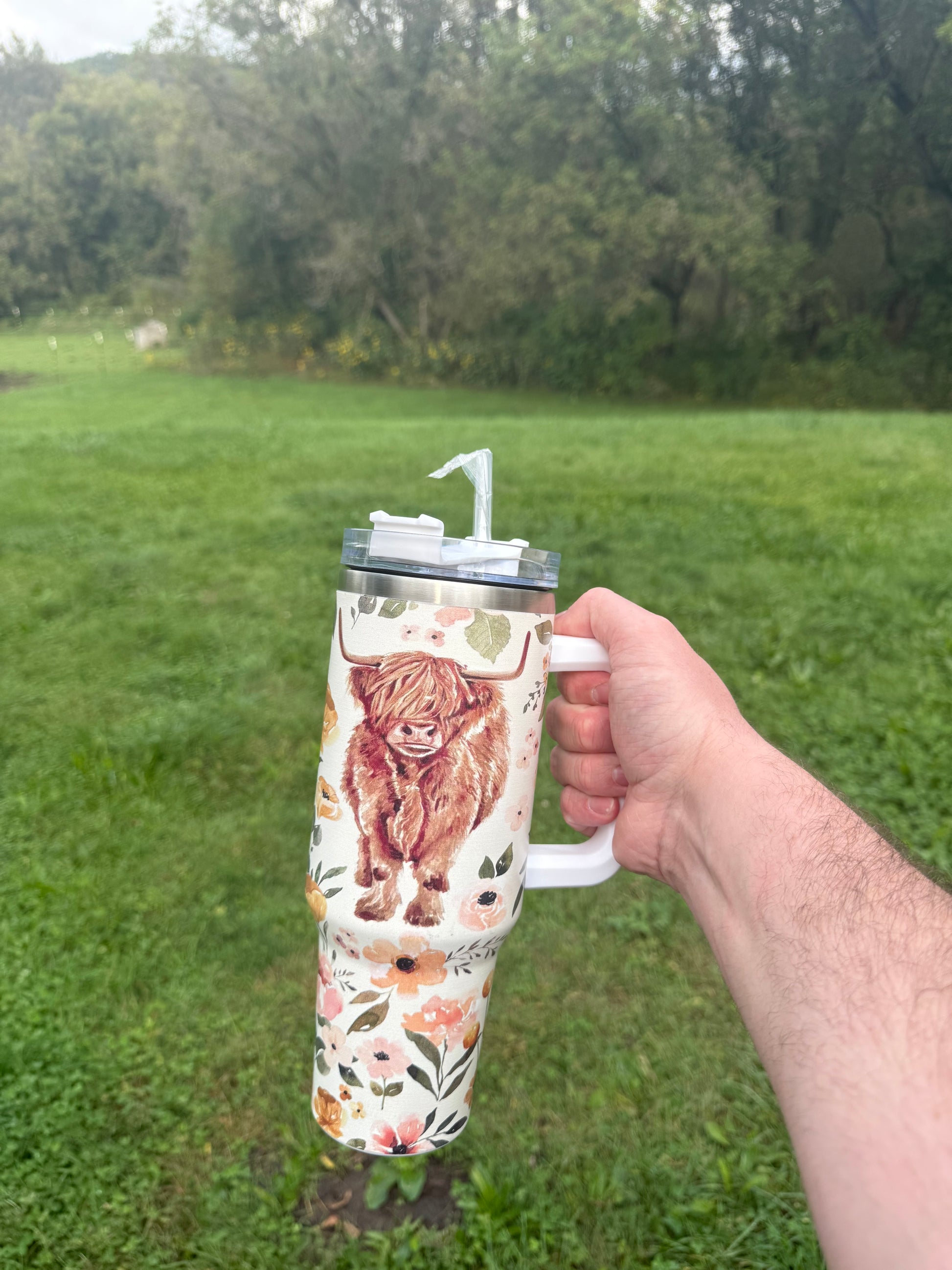 Highlander cow with wild flowers on a 40oz cup.